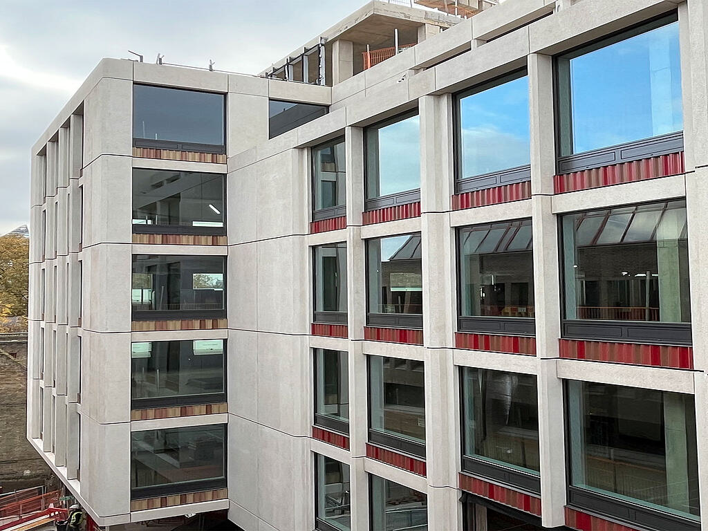 Leistungsspektrum 5.000 m² Elementfassade, 4.300 m² Faserbeton-Verkleidungselemente.